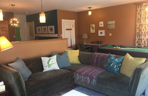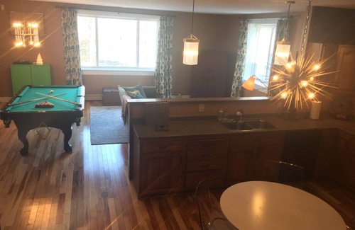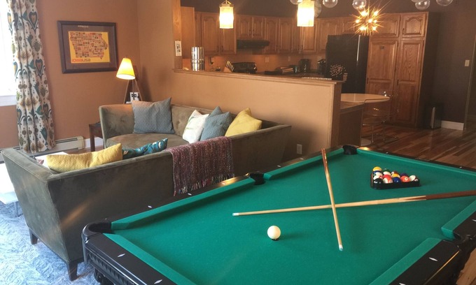 No cleaning Fee! Welcome to The Decorah Loft – a spacious two-bedroom, two-bath apartment with over 1,600 square feet of comfort. Located between the historic Hotel Winneshiek and Mabes Pizza, you'll be just steps from Decorah's top restaurants, museums, and shops. Unique to Main Street: Each bedroom has its own private full bath; perfect for two adult couples wanting their own bath. The full kitchen opens to a large living area, complete with a 7-foot pool table and sectional couch. Longstanding vacation rental with lots of repeating guests. The Loft’s two-car attached garage is a favorite of Luther Parents visiting in the winter and offers secure storage for vehicles, bikes, kayaks, or fishing gear. Keywords: LOFT, APARTMENT, UNIT, DOWNTOWN, STORAGE, GARAGE, STEPS,