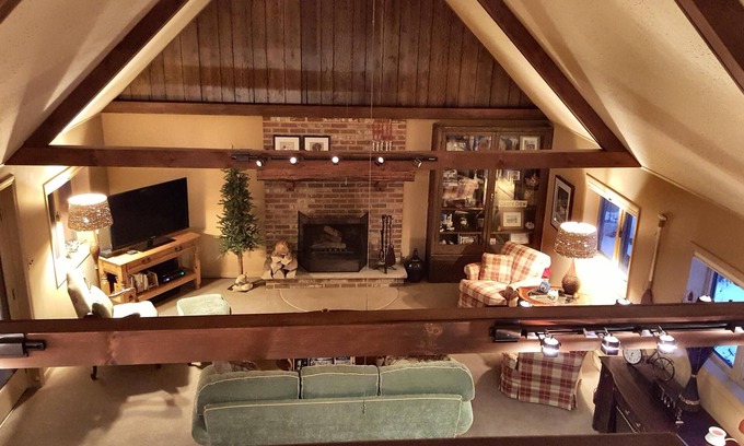 Also on the first floor is a bedroom with twin beds, full bath and separate laundry room. Upstairs is a cozy loft with a queen bed, full bath, and a large main bedroom with queen bed and river view.