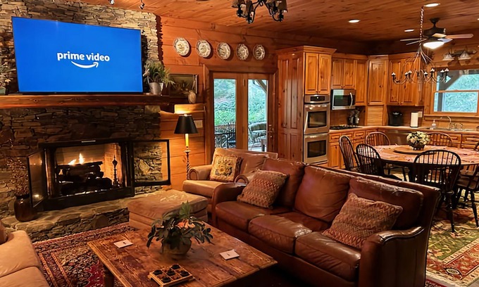 The cabin is appointed with two great rooms, one upstairs and one down, guests can enjoy socializing in the cozy atmosphere of a mountain lodge. Features scenic views, multiple fireplaces, Wrap around porch with many seating areas. we have added an outdoor firepit.