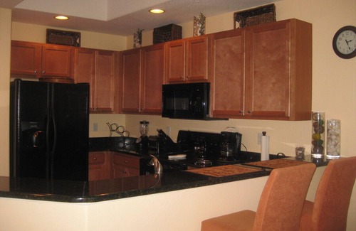 The kitchen comes fully equipped along with granite breakfast bar and all appliances. There is a separate laundry closet with a stackable washer/dryer, ironing board, iron, mop, broom and starter detergents.