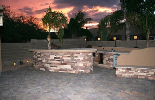 The master suite has a garden tub and separate shower. Sliding doors from master opens to a relaxing oasis waterfall. This backyard has mountain views, an extended patio, custom lighting, 3 ceiling fans, 2 outdoor heaters, outdoor full kitchen with sink, a large Twin Eagles BBQ grill with dual side burners, flagstone eating area with bar stools, and cozy seating next to a fireplace.