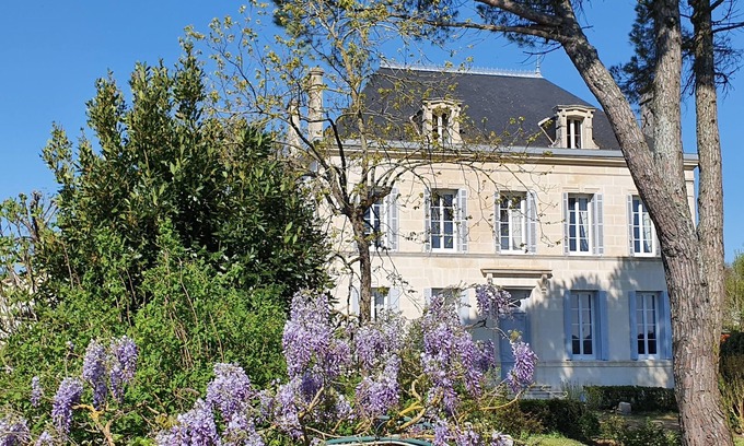 A typical 19th century Charente Manor House set in spacious gardens with a 12 x 6 metre pool. The 7 rooms are over 2 floors with private bathrooms; some rooms share a bathroom. The unique ambiance of the house comes from the high ceilings, beautiful, large dining room with views to the vineyard next door and huge lounge with comfortable sofas and chairs, fireplace and an elegant hallway. Bedrooms have high ceilings and are tastefully and luxuriously decorated. The large kitchen is fully equipped with double oven, gas cooker, grill, microwave, dishwasher and fridge freezer. There is a dining table in the kitchen. There's plenty of space for barbecues and lazing around in the extensive gardens, with sun-beds and garden furniture. The house has tall double-glazed windows which are newly installed.