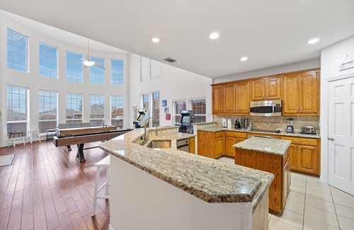 • Fully equipped with a refrigerator and ice maker, dishwasher, microwave, oven, electric stove, toaster, and blender.