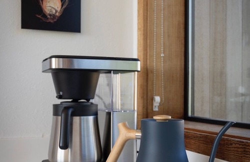Chemex pour over coffee maker, Fellow electric kettle and OXO coffee maker, coffee grinder.