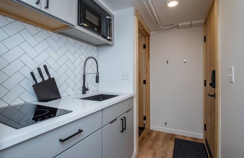 The apartment encompasses an open dining room and kitchen layout. Designed by the architect owner to maximize the light from the garden level windows, the interior has a southwest-minimalist modern design. The full bathroom and the kitchenette immediately greet guests once they step through the front door. The kitchenette is equipped with everything one would need to make a home-cooked meal.