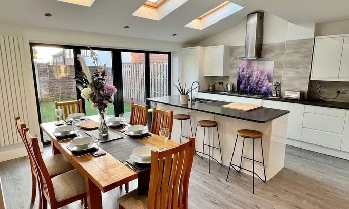 A fully equipped modern extended 3/4 bed family home, sleeping up to 8 adults/children (6 beds) and one infant (travel cot available upon request). The light and airy kitchen/dining area is perfect for that indoor/outdoor feel, and for preparing family meals. A choice of reception areas including an open living space with TV or the cosy snug area for those family films. With Superfast Broadband, Smart TVs and USB sockets to keep everyone entertained. Bedrooms with thoughtful colours and high quality cotton linen ensure a peaceful nights sleep.