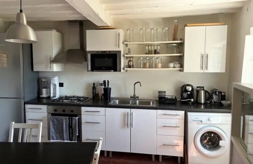 The house is 3 stories. The kitchen and living room are on the first floor. The bathroom and double room on the second floor and the 2 queen rooms are on the third floor. There is also an addition bathroom in the cellar.