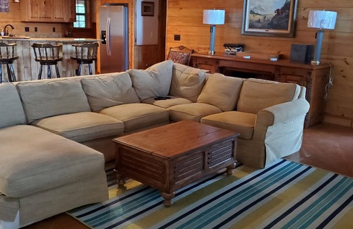 A roomy kitchen adjoins a spacious family area w/ a convenient front room half-bath. (So, 3 1/2 bathrooms total.) Large flat screen TV in the front family room and additional flat screens in each bedroom with DISH service to each. The large family room fireplace sets everything off and cut firewood is available in the rack in the garage!