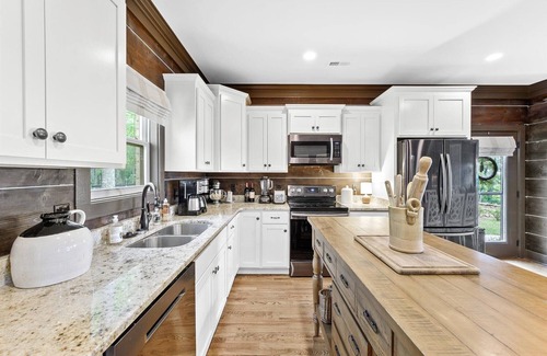 About the kitchen: From kitchen aid mixers, to an oven that shows the exact temperature as it climbs to destination w a toaster convection feature, we carry pamper chef and la Creusent cookware for great cooking experience. We wanted to make all guests happy so we have a traditional coffee maker and a Keurig all in one! The dishwasher even opens up slightly when complete so the dishes dry appropriately. The kitchen island is to die for- you can buffet style the food and the dining room table sits 10 whiffle there are several additional chairs to sit 11 & 12 or you can sit 10 comfortably outside just 30 feet away at an oversized table under covered deck.