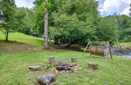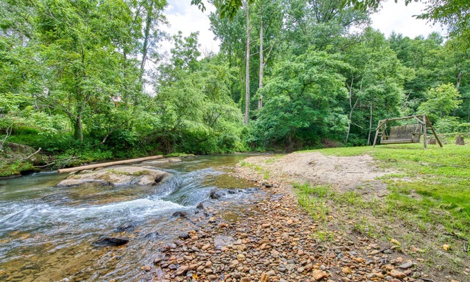 Watch for the fog to clear and the mountain to appear in the mornings. The deck is furnished and spacious, and the kids will love romping around the yard while you fire up the private gas grill to throw a little char on some freshly caught fish from nearby Coweeta Creek. The creek also features rapids that are perfect for summertime tubing! Enjoy reclining on the hammock by the stream, and rinse off from swimming or fishing in the outdoor shower. Play a game of cornhole with the family! In the evenings, gather everyone around the firepit to share some lively conversation or enjoy some stargazing. The private washer/dryer will help keep everyone's laundry sparkling clean, so you can afford to pack light for your trip. Don't forget to use the free WiFi to research a few fun outdoor activities or download a playlist to your device. And when it's time to tuck in for the night, you'll have two spacious bedrooms to settle into including a main bedroom with a gas fireplace. You'll enjoy a prime location to enjoy gem and mineral shows in the gem capital of the world.