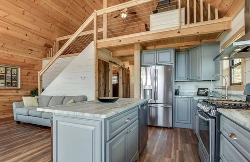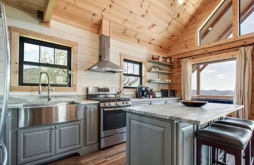 Lovable cabin in a gated community with the best 180 degree views in Tellico Plains! Only three miles from the Tellico River, restaurants, and town. The wide and open deck provides room for entertaining or just relaxing in the hot tub and enjoying the sunsets and extraordinary views of the Appalachian Mountains and Cherokee National Forest. This cabin offers a rustic chic design and open floor plan with towering windows to showcase the panoramic views from almost every seat in the house. The kitchen is fully equipped with essentials and a gas range, farmhouse apron sink, textured granite countertops, abundant cabinet space, and an island with a bar for dining. Hardwood floors are throughout the cabin. Authentic barn slider doors for the bath and bedroom downstairs. The bathroom offers double sinks and a spacious walk-in tile shower. The loft bedroom has the same breathtaking views as the lower level. Charcoal cooking grill out front (don’t forget to bring charcoal, but seasonings/condiments provided in kitchen).