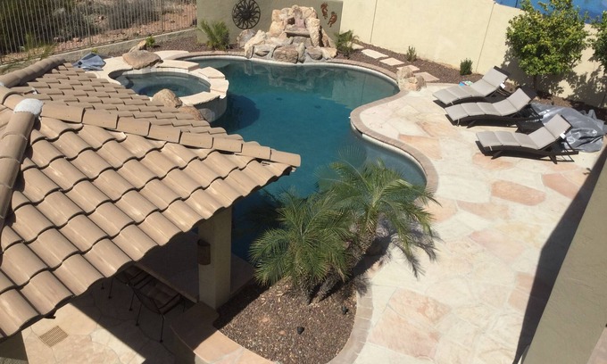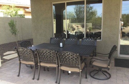 Our home has an amazing setting right next to Superstition Mountain with a beautiful view of the desert from our backyard. Our 5 bedroom home offers 3 bedrooms with queen beds, 1 bedroom with triple bunk beds and the master suite has a King sized bed. You will enjoy sitting in the recliners in the master suite either watching your favorite thing on TV or just sitting quietly as you sit in awe at the beautiful mountain right outside the windows. The master suite also has a patio that you can enjoy a beautiful view of the backyard, the desert, the golf course and the Mountain. The luxury master bath has a oversized bathtub set in a bay window overlooking the mountain and shower. We have a pull-out sofa both in the formal living room as well as the den on the main floor.