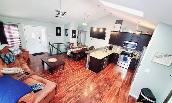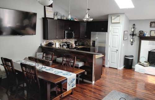 A wood burning fireplace and reclining sectional that seats 4 adults comfortably in the living room. We have a 70” wall mounted television off the dining area next to the kitchen that creates a comfortable experience for everyone! There’s a Keurig & traditional coffee maker plus plenty of kitchen gadgets along with typical seasonings & condiments available for our guests. We have an XBox one with 2 controllers & 2 headsets. Our propane bbq grill & electric smoker are on the back patio - feel free to use anything you need during your stay!
