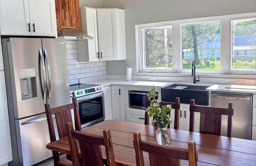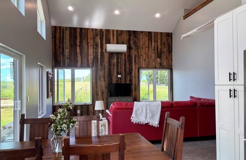 While this newly constructed home is only minutes from Lane Stadium and downtown Blacksburg it is situated peacefully between a beautiful country church on one side and grazing cows on the other. The house pays homage to the historical 1-room school house that once stood on the same ground and so we call this property the School House or School House Rock. The house has three bedrooms with private baths for each. The lofted bedroom has a new king bed. The two bedrooms on the main level have one king and one queen size bed. The kitchen and main living area are completely open and make for a space that is conducive to conversation, music, or watching sporting events on the large screen tv. Whether you are in town for a game, graduation, or just because, this house offers a welcome change from a crowded hotel and limited parking.