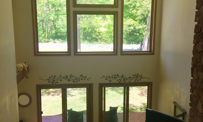 The Great room is 26 foot vaulted ceiling with beautiful large windows, and beautiful large stone fireplace (gas). Has huge comfy sectional sofa, large TV, internet. The kitchen is fully furnished! Just bring your favorite food! 2 more bedrooms down stairs, with lofts.
