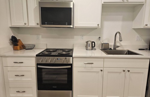 Unwind in Ashland in this beautifully designed new studio. This cozy space is perfect for solo travelers looking for a pleasant retreat. Enjoy all the comforts of home with amenities like WiFi, full kitchen, flat screen tv and washer/dryer. The luxury queen mattress includes soft, pressure-sensitive memory foam technology so guests can relax and sleep restfully. The bed is connected to a murphy cabinet, so it can be left down or lifted up into the wall to reveal the couch.