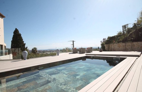On the heights of Mandelieu la Napoule, beautiful new villa with a panoramic sea view located on a plot of 1700m ² in terraces. Pool (7m x 3.5m, depth 80 / 200cm, cover), 250 sqm terrace with garden furniture, deckchairs and BBQ. Parking 3 cars. Shops and restaurants at 900m. Center of Mandelieu with 2km. Cannes 10 km.