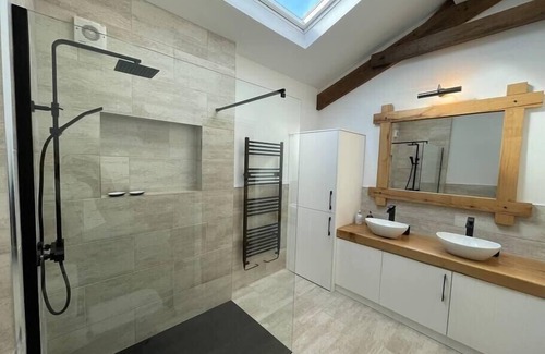 There is a luxurious bathroom with modern shower with ‘his’ and ‘hers’ sinks.