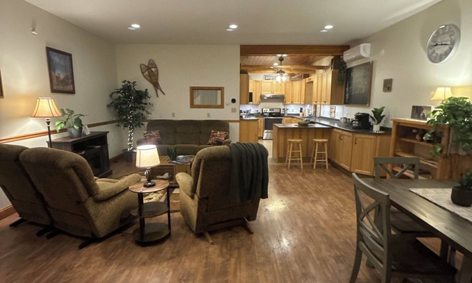 Welcome to Maine Place, a charming 2-bedroom home in Bridgewater, Maine, where comfort and relaxation meet rustic elegance. Designed with your comfort in mind, this cozy property features a spacious living room with plenty of seating, perfect for unwinding after a day of exploration. The fully equipped kitchen allows guests to enjoy home-cooked meals, while two inviting bedroom suites provide the perfect setting for a peaceful night’s sleep. Whether you're cozying up in front of the fireplace or enjoying a peaceful stroll through the backyard, you'll appreciate the serene atmosphere of this beautiful retreat. The home is equipped with all the amenities you could need, including high-speed Wi-Fi, a full kitchen, and dedicated workspaces in each bedroom suite. For outdoor enthusiasts, the ITS 83 Snowmobile and ATV trail is just moments away, offering year-round access to Maine’s natural beauty. Maine Place is more than just a place to stay – it’s the perfect destination to create lasting memories, no matter the season.
