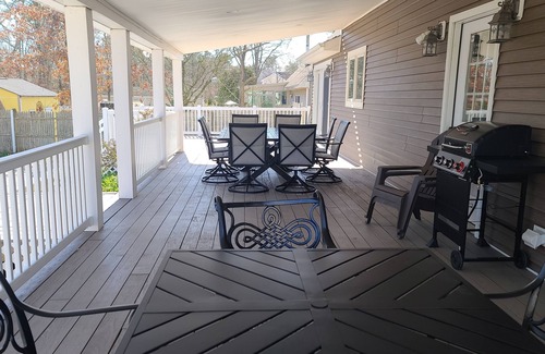 7 miles from the beach, near many restaurants and activities. This large spacious home in Ocean Acres has 6 bedrooms, large coverered deck, above ground pool, with additional pool height decking. Newly renovated, and very clean. Includes beach chairs.