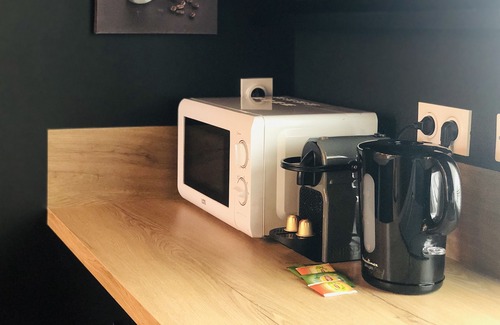 The kitchen is equipped with an oven, a stovetop, and a refrigerator, as well as a coffee maker, an electric kettle, and a microwave. Bathroom amenities include towels, toilet paper, and soap. Other amenities include a living room, bed sheets, heating, and a dining table.
