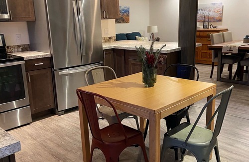 The large primary bedroom has a queen bed, tiled bathroom, and has a sitting area with a pull out full bed that can be walled off with sliding pocket doors to create a semi-private second bedroom. Another tiled bathroom services the other bedroom, with queen bed, to accommodates the rest of your family. The kitchen is stocked with amenities and small appliances for preparing your meals. Contemporary, open kitchen and dining room invite warm family gatherings. The tiled showers and bathrooms are elegant and spacious.
