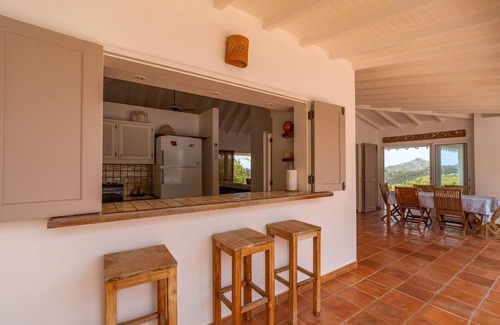 In a vast and comfortable living room aired by large openings, the vacation home O PURE is the right place to rest and relax: beige and orange-toned sofas, cozy lighting and weathered wood decorate this convivial space in a welcoming atmosphere. Natural light comes in through large windows through which you and your guests will enjoy the gorgeous view over the neighboring hills. The dining room is located at the back and welcomes you around a beautiful oval table in exotic wood for delicious meals. The kitchen is well equipped with a breakfast bar and stools. All is calm and serene in a lovely Caribbean charming atmosphere.