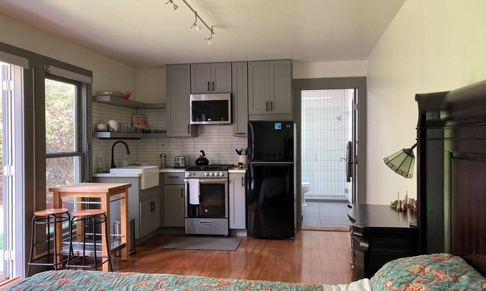 Sweet, light and airy studio apartment located in a charming garden, with separate entrance. Freshly renovated with all new fixtures in the bathroom and kitchen, including radiant floor heating in the bathroom and walk in shower. Ideal for a single traveler and with all the basic amenities included. Quiet and safe neighborhood with easy street parking, beautiful tree lined street. Please note there is a rock path to the studio through the garden.