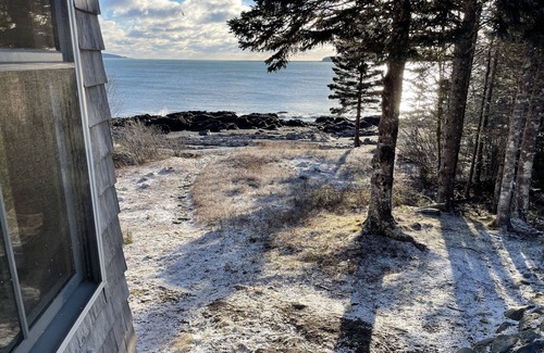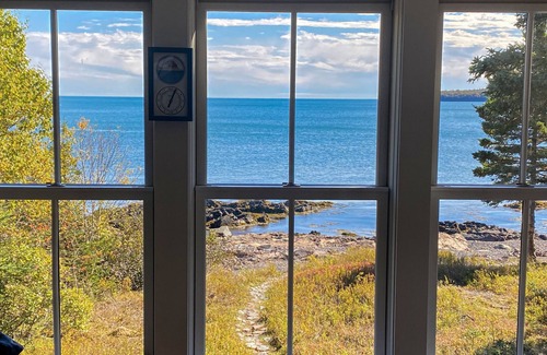 The views of the islands and open ocean from all 3 levels of the home are truly breathtaking. Enough beds to sleep 6 guests comfortably, and with 2 bathrooms, this classic coastal Maine home features a spiral staircase, wall to wall windows on the first floor living space providing panoramic views of the water, and newly refinished original hardwood floors from when the cottage was built in 1905. There is a one of a kind bench available for guest use that provides a prime spot to chill by the sea and recharge. Guests can explore the trail through the woods that leads to an observation deck with two rocking chairs. The serene spot is next to a small water fall and overlooks the bold rocky coastline.