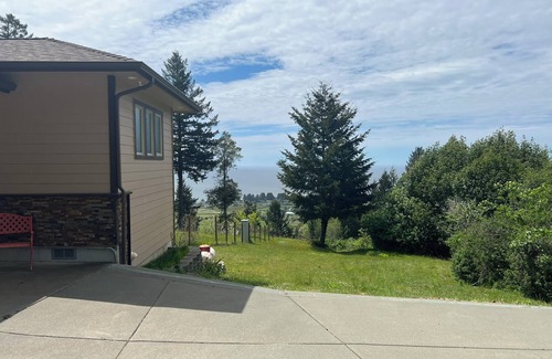Beautiful Ocean Sunsets is a 2015 beautifully maintained 3-bedroom, 3½ bath, 3,059 sf contemporary style home that sleeps six (6) overlooking the Pacific Ocean. Each room has a beachfront feeling. The hardwood floors add to the combination of mountain and ocean beach feeling. The granite counters accent the stainless-steel appliances and wood cabinets. The kitchen is open to the living room and allows conversations to take place while preparing meals between visits to the ocean and mountains. The south main bedroom provides welcome, well-deserved tranquility at the end of the day. The view from this room is one of the most romantic and eye-catching views of the harbor coastline in Brookings. The north main bedroom provides both an ocean view and downtown Brookings views. The downstairs bedroom area has ample sleeping and office accommodations. This area will meet the needs of traveling partners or siblings. The backyard (facing the ocean) has a lovely patio area. There is also a fruit orchard and a fenced garden area. Play yard games outside and read or watch television inside. Transform any ordinary life into one that is designed to create a less stressful era. Enjoy games and reading a personally autographed book by one of the local authors. You may also participate in biking and hiking trails. You will want to come back many times to this home away from home.