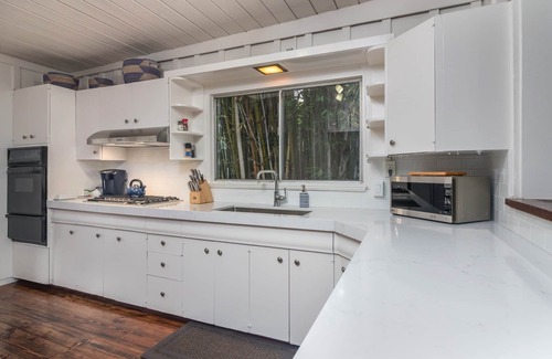 The front deck has a Bistro table and chairs, providing an unobstructed view of the ocean and its perfect sunsets. Entering into the home, leads you to a fun beach vibe interior with gorgeous wood floors, crisp white walls, and a cozy modern décor. The living room has a giant curved glass window that looks out to the Pacific Ocean. Relax on the sectional sofa while enjoying time with friends, or turn on the large flat-screen TV and curl up to watch a movie. If you feel like taking a break from the world-class cuisine that the neighboring towns of Santa Barbara and Montecito have to offer, utilize the fully-equipped and completely remodeled kitchen. There is a dining table inside that seats 6. There is also an outdoor table for six on the back deck that is accessed through the kitchen's French doors.