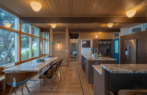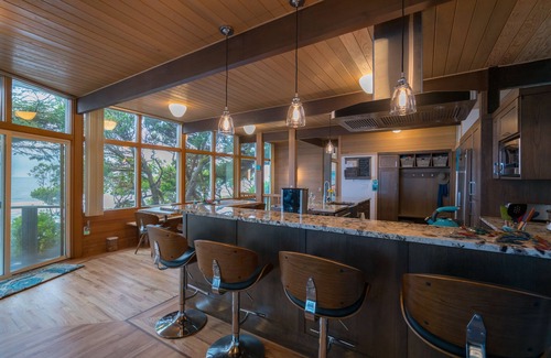 Stunning mid-century modern ocean front vacation rental in Newport, Oregon. Feel like you walked into a Frank Lloyd Wright home with it's expansive great room that features a high roof line with floor to ceiling windows that provide a panoramic ocean view. Remodeled in 2017, upscale 3,200 square feet house, perched on a cliff overlooking the Pacific Ocean. Embrace nature as you relax in the great room or soak in the hot tub watching as birds soar overhead and whales are often spouting.