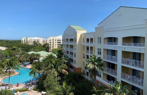 Beautiful, tropical view from balcony patio overlooking intriguing waterfalls, pool & walking areas. Mini activities to do on site..
