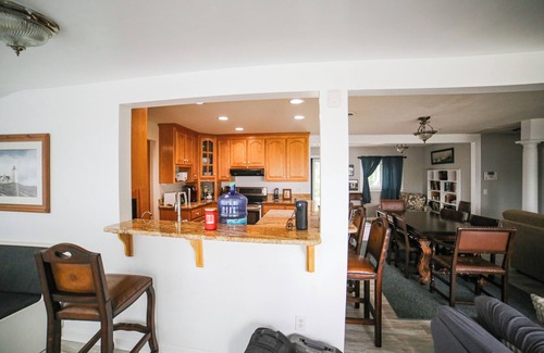 Welcome to York Overlook! Enjoy this three bedrooms house for the entire family! Put the kids in the bunk room with a single over double bunk bed and a double bed, the kids will enjoy the primary bathroom complete with a shower and separate soaking tub to splash in. There is a second bedroom on the main floor furnished with a single over double bunk bed, great for kids or adults to enjoy. There is a hall bathroom with laundry room and shower also. Upstairs is the primary bedroom that is a true RETREAT with a king bed, separate sitting area, full bathroom and even a lovely balcony to enjoy. The house includes great spaces for recreation for all! the main living area is a fantastic OPEN CONCEPT space including a wonderful updated modern kitchen including breakfast bar seating. There is a cozy kitchen table and a large dining table along with comfortable seating to watch tv and movies. Enjoy AMAZING VIEWS from the full wall of windows. Outdoors features a porch overlooking the river and fenced in yard. The home is on a hill overlooking the river. Enjoy a fabulous dock with a launch for kayaks and a slip for your boat. Home is complete with everything needed to enjoy the water, kayaks, and paddles and life vests. Set up a picnic or play with the kids on the sandy beach by the river. There are outdoor games such as volleyball and cornhole, as well as a myriad of indoor entertainment including table shuffleboard, darts, foosball, games and table puzzles. Truly a WATERFRONT paradise for your family to enjoy.
