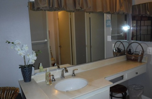 Master BR is very large with cathedral ceiling, 2 Queen-size Platform Beds (sleeps 4), a sink/vanity & dressing area, ensuite bath with enclosed shower & toilet, and large triple-door closet. There’s another walk-in closet which houses self-inflating Queen & Twin double-high mattresses, Graco/Pack’n’Play, Extra TP, etc. It has a 50” TV with TWC. (With extra inflatable beds, can sleep 9, including infant.) Or, you can set up 2 Queen inflatables in the Living Room floor area, and 1 Queen or Twin inflatable in the stepdown Kids' Indoor Play Area.