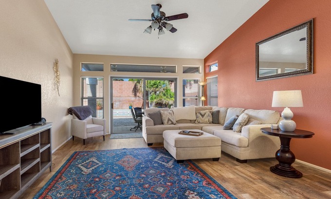 The master bedroom offers the same high-ceiling style as the living room, with a southwestern style wooden king bed and a sliding glass door right out to the back patio. Stream Netflix on the TV or just relax the night away in the jacuzzi tub!