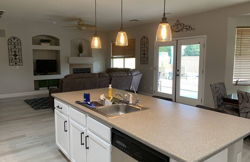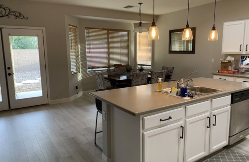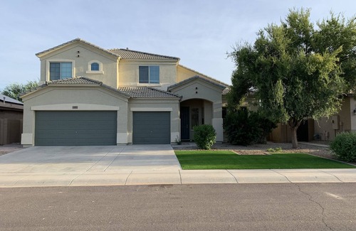 Two-story single-family home in a quiet residential neighborhood close to large park. Five bedrooms 3 1/2 baths with outdoor pool and hot tub and patio as well as front driveway adjustable basketball hoop. Pool table and ping-pong table in the front room for your usage. Very clean, light and bright home with full kitchen access, high-speed Wi-Fi throughout the house. Close to baseball fields, stadiums, area hiking trails and many restaurants as well as a Children's park at the end of the street. Backyard has patio misting system to cool you off while you're relaxing by the pool. Pets are welcome and the home has a built-in doggie door with access to the backyard.