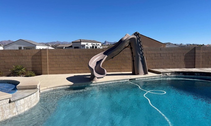 Awesome Desert Escape. Sits on 1/3 Acre, with sweeping mountain views and incredible sunsets. Enjoy the very large pool , heated spa, waterslide, water features and backyard entertainment space including large, long countertop, gas grill and firepit for cool nights. The 11' deep pool stays refreshing all year long. The water slide coupled with the large Baja shelf and heated 10 person SPA make this a water lovers paradise. The Kids will wear themselves out going down the slide, then wrap up a long day making S'mores over the fire. Over 1500 sq. ft. of outdoor covered patio has great summer shade and a large 65" TV to catch the game or watch a movie while relaxing on the large out door couch or even sitting in the spa. The kids love the "Dive In Movie" watching movies from the spa. You'll enjoy a very comfortable Interior space with a ton of board games, poker chips, cornhole, TV options and other fun stuff to make for lots of great memories. We like to cook, the kitchen is very well appointed with all the utensils and tools you'll need to keep everyone fed and happy.....whether its making a margarita or toasting marshmallows over the fire we've got it covered. Well behaved kids and pets are welcome, this is our family's home and we want your friends and family to enjoy it as much as we do.
