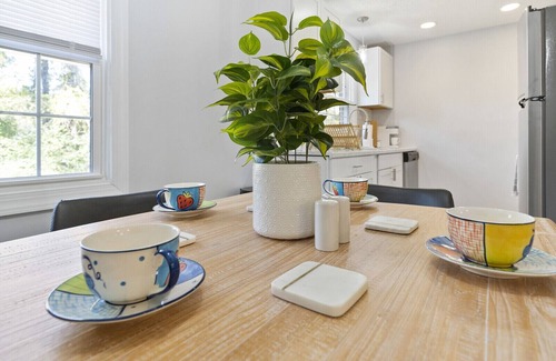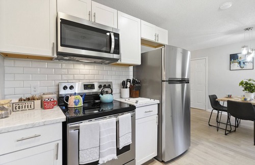Your family will be close to everything when you stay at this centrally-located home in the heart of Jacksonville, NC. The brand new furniture, mattresses, and linens in this home were hand picked for comfort! The home features 3 beds, 1 bathroom with shower and bathtub, washer/dryer, full kitchen with everything you need to cook some home cooked meals, a coffee/tea bar, a fenced in back yard and patio with a wood burning fire pit, a HUGE television with enabled Roku, and electric fireplace.