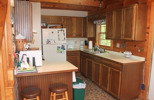 Sleeps up to 12. Upstairs loft: King bed, small bathroom. Bunk room: two sets of bunks(4 beds). 2nd Bedroom: queen bed. Basement room: Queen Bed. Full bathroom on main floor and basement. Living room couch is also pull out bed. Living room with log fireplace. TV, Dish network, Wifi, DVD, stereo, large dinning table, fully equipped kitchen. Large deck with gas grill. Laundry room with washer/dryer. We are pet friendly, pet fee required