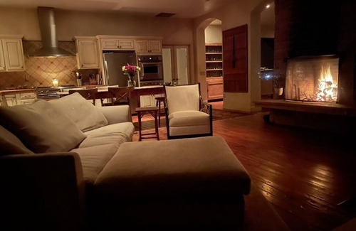 - Kitchen-adjacent seating area with upholstered furniture, wood-burning fireplace, flat screen TV, and another 12' picture window with expansive valley views all the way to the coastal mountains. French doors open to pool, outside dining area. Gorgeous sunsets are guaranteed just about every evening.