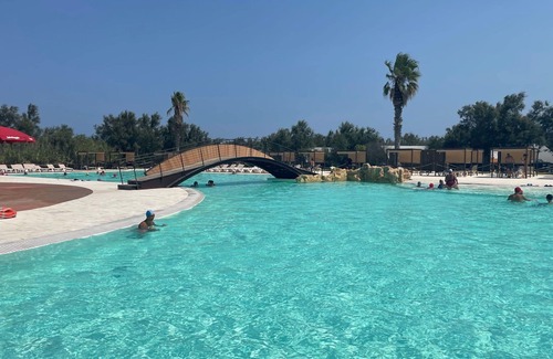 "Happy Camp Mobilhome Torre Rinalda" is a large, child-friendly holiday village located in Torre Rinalda, Italy. Enjoy the convenience of direct beach access, just 150 meters from the sea. The property boasts a 15-hectare fenced area with trees, a swimming pool (25 x 15 meters, depth 80 - 120 cm, available seasonally from May 27 to September 8), and a children's pool. Additionally, it offers amenities like a tennis court, basketball court, volleyball court, terrace, and a children's playground.