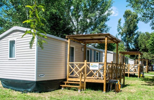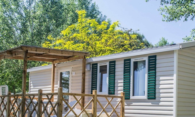 The mobile home is equipped with a shower and separate toilet for your convenience. Air conditioning is available for an additional fee. Outside, you'll find a partially roofed terrace with furniture, an electric barbecue (portable), and two deck chairs for your enjoyment. Mosquito nets are provided for your comfort, and a reserved parking spot is available for one car. Please note that this is a non-smoking property.