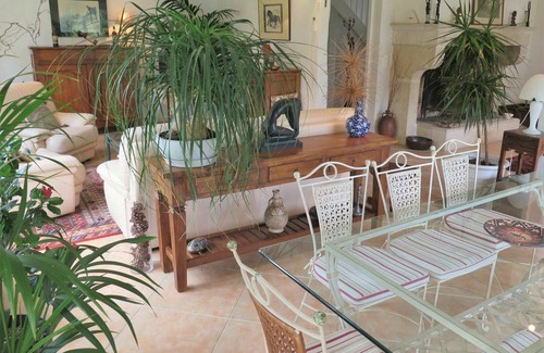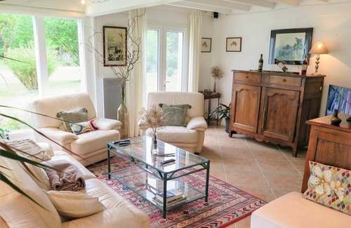 "Lous Bernets", 4-room villa 210 m2 on 2 levels. Object suitable for 4 adults + 2 children. Spacious and bright, comfortable and tasteful furnishings: large living/dining room with panoramic window with open-hearth fireplace (only for decoration), dining nook and cable TV (flat screen). Exit to the garden. 1 room with 1 french bed (1 x 160 cm, length 200 cm). Exit to the garden. Large, open kitchen (oven, dishwasher, 4 induction hot plates, toaster, kettle, microwave, freezer, electric coffee machine) with dining table. Exit to the terrace. Shower, sep. WC. Upper floor: 1 large room with sloping ceilings with 1 french bed (160 cm, length 200 cm). Exit to the balcony. 1 children's room with sloping ceilings with 2 beds (90 cm, length 190 cm). Shower/WC, double hand-basin. Electric heating, air-conditioning. Large terrace 40 m2, roofed. Terrace furniture, barbecue (portable), deck chairs (4). Beautiful view of the forest. Facilities: washing machine, iron, mosquito net, baby cot. Internet (WiFi, free). Please note: suitable for families. Non-smoking house. Smoke alarm.