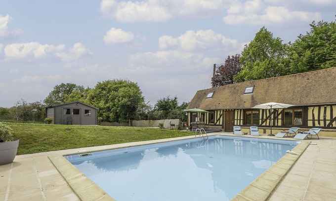 Simple single-family house "La Petite Normande". Property composed of main house and outbuilding, in a hamlet 100 m from the centre of La Roque-Baignard, 6 km from the centre of Cambremer. For shared use: table tennis. Private: natural state property 1'500 m2 (fenced) with lawn, swimming pool heated, secured (55 m2, depth 140 cm, seasonal availability: 01.Apr. - 30.Sep.). Pool maintenance by the owner/gardener. Storeroom available. Parking (for 3 cars). Shop 5 km, supermarket 5 km, sandy beach "Plage de Cabourg" 24 km, 15 km. Golf course 25 km. Nearby attractions: Deauville 24 km, Lisieux 14 km.