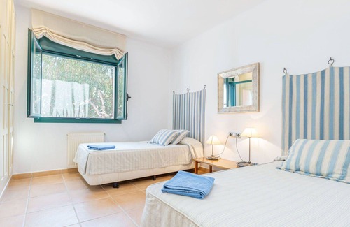 The villa features a large kitchen equipped with an oven, dishwasher, four ceramic glass hob hotplates, a toaster, a kettle, a microwave, a freezer, and an electric coffee machine. Outside, you'll find a large patio, a garden spanning 650 square meters, terrace furniture, and a covered balcony. Additional facilities include a dryer, an iron, a children's high chair, a baby cot, and a hair dryer. Internet access (WiFi) is provided free of charge, and reserved parking is available for up to four cars. Please note that this is a non-smoking property, and the TV channels are available only in Spanish, French, and German.