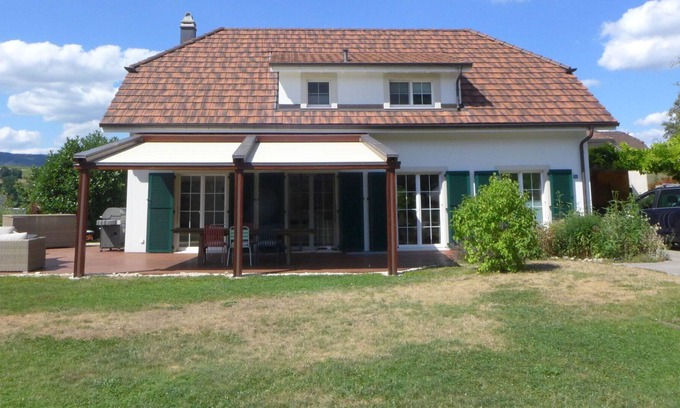 Courfaivre 6 km from Délemont: Beautiful villa "Chambion 14", 459 m a.s.l 3 storeys, surrounded by trees and meadows. In the resort, in a quiet, sunny position in the residential district. Private: property 1'400 m2, large garden. (slide, swing). In the house: central heating system, drying room. Roofed, parking (for 2 cars) at the house. Grocery 500 m, supermarket 2.8 km, bus stop 400 m. Hiking paths: Franches-Montagnes 25 km. Please note: car recommended. Neighbourhood highly sensitive to noise. Quietness and good behaviour expected.