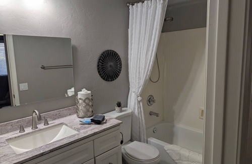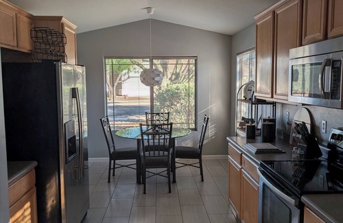 Welcome to this beautiful house in Tucson. This amazing property features 3 bedrooms with 1 king bed and 2 queen beds, perfect for a tranquil getaway. With 2 bathrooms equipped with a shower, bathtub, hair dryer and basic essentials, guests can relax and unwind. The house also offers amenities like a fully stocked kitchen, heating, AC, fireplace, walled in back yard with a BBQ grill, WiFi and cable TV. A great place to call homebase while you're away, we hope you enjoy your stay.