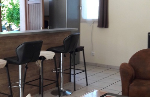 Air-conditioned semi-detached house with 6 beds, equipped kitchen open to a dining room and lounge, all comfort TV, home theater, music, games, overlooking a garden with swimming pool and dining area, two beautiful bedrooms, 1 bathroom with bath and toilet.