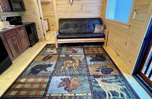 This custom-designed 100% wood timber cabin offers two bedrooms with a loft and can sleep a total of 10 guests. Full kitchen, new appliances, walnut cabinets and custom wood furniture, dark oak stain finish. BBQ pit, fire pit, and picnic tables for outdoor activities with the family. Everything is brand new!